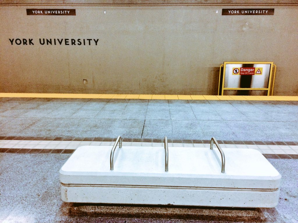A more obvious example shown above is a bench at the York University subway station, which has metal dividers placed unusually close together to prevent people from laying down. This makes the bench less accessible to many, such as the elderly, the disabled, and pregnant women.
