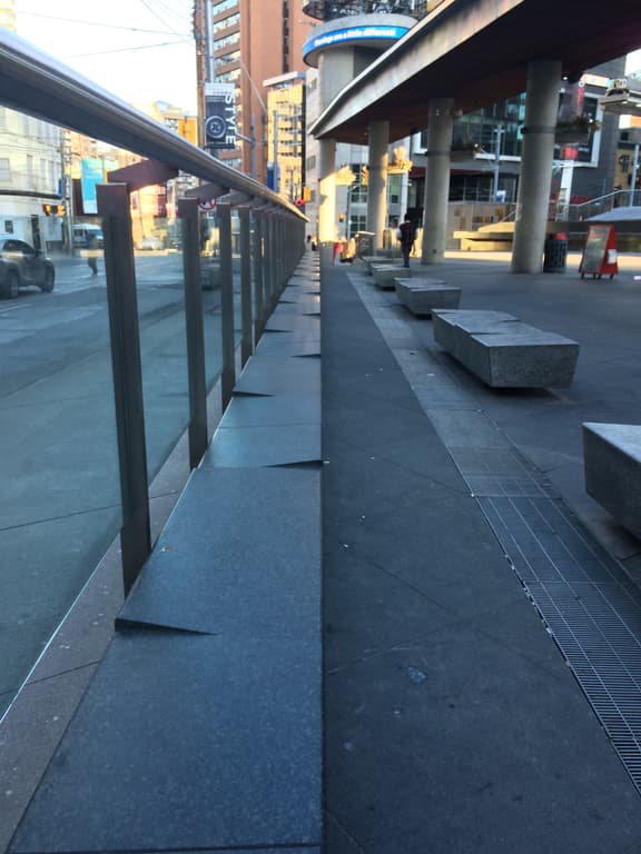 The seating ledge at Yonge-Dundas square shown above may not seem particularly special, but the alternating angles on the blocks are a tactic to prevent people from skateboarding and sleeping on them.